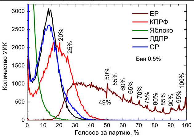 Подчиняется нормальному распределению и процент проголосовавших за ту или иную партию - на одном участке за КПРФ 20%, на другом 15%, на третьем 21% и т.д. Если взять и построить график, то получится «колокол» с максимумом около 19%, участков, где за КПРФ отдали 15 и 25% будет меньше, а где 5 и 35% совсем мало и т.д. И так по каждой партии... Кроме Е..ой России!