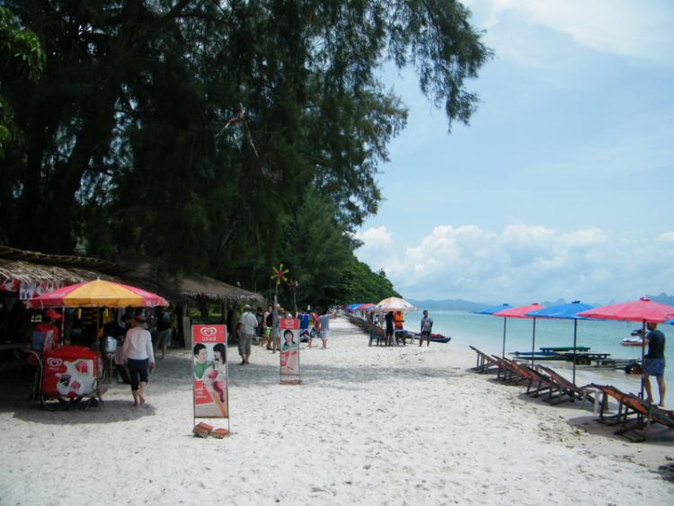 Расскажу, что знаю, об экскурсиях по достопримечательностям пхукетского курортного узла. Мелочей касаться не буду - на Пхукете есть буддистские храмы, в основном для местных, есть Биг Будда на горе над Ката-бич. Слоновьи питомники, змеи, черепахи, крокодилы, парки бабочек и орхидей. Шоу трансвеститов "Fantasea"  Главные эксклюзивные аттракции - ландшафтные. В первую очередь острова - Пха-Нга (острова Джеймса Бонда), Пи-Пи, Симиланы. Скалы и пляжи побережья Краби. Два национальных парка в гористой местности на материке - Као-Лак и Као-Сок. Самолично побывал на экскурсии на Пха-Нга, резонно рассудив, что это круче всего. И судя по всему, не ошибся. Острова имеют коммерческое название для туристов - Джеймса Бонда, и расположены северо-восточнее острова Пхукет в углу одноимённого мелководного залива Пха-Нга. Экскурсий туда организуется много разных. Я взял тур компании "Silver Hawk". Выбрать именно его посоветовала очень милая девочка в уличном турагентстве на углу у моего отеля. Важным было то, что путешествие осуществлялось на большом кораблике. Остальные туры - по большей части спид-боты, которые чувствительны к погоде - при сильном волнении экскурсию могут отменить. Ну и острова архипелага посещают разные - за один заезд всё не посмотреть. На большом кораблике время чистого плавания заметно больше, но мне это понравилось - успеваешь проникнуться и пропитаться солёной атмосферой этого чудесного водного мира. На палубе вполне можно позагорать, и вообще путешествуешь не спеша, без суеты. Первым заходом был остров Нака. Он неподалёку от пхукетской пристани, почти равнинный, и туристов туда привозят на настоящий пляж Баунти, искупаться и выпить экзотических коктейлей. Песочек заметно белее, чем на самом Пхукете, в окрестностях баров и лавчонок слегка замусоренный, но чуть дальше вполне кондиционный. Ну и море неожиданно тихое и спокойное, по контрасту с мощным океанским накатом пляжей андаманского побережья.