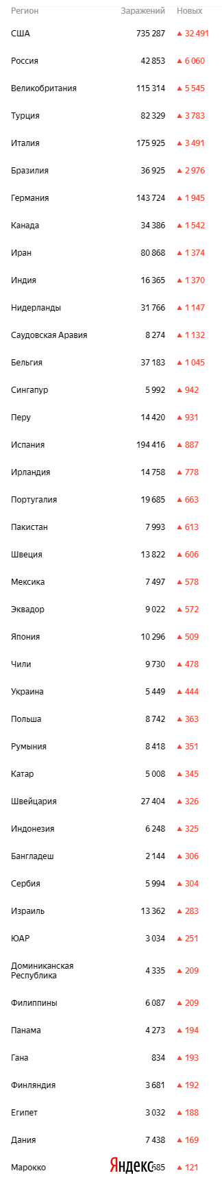 Imho, правильнее считать не общее количество заражённых, а количество заражённых за день. Тут Россия на почётном втором месте после США. А по общему количеству зараженных мы вас перегоним уже на следующей неделе, у нас ежедневный прирост в районе 20-30%, как до карантина. А там и до США будет рукой подать.