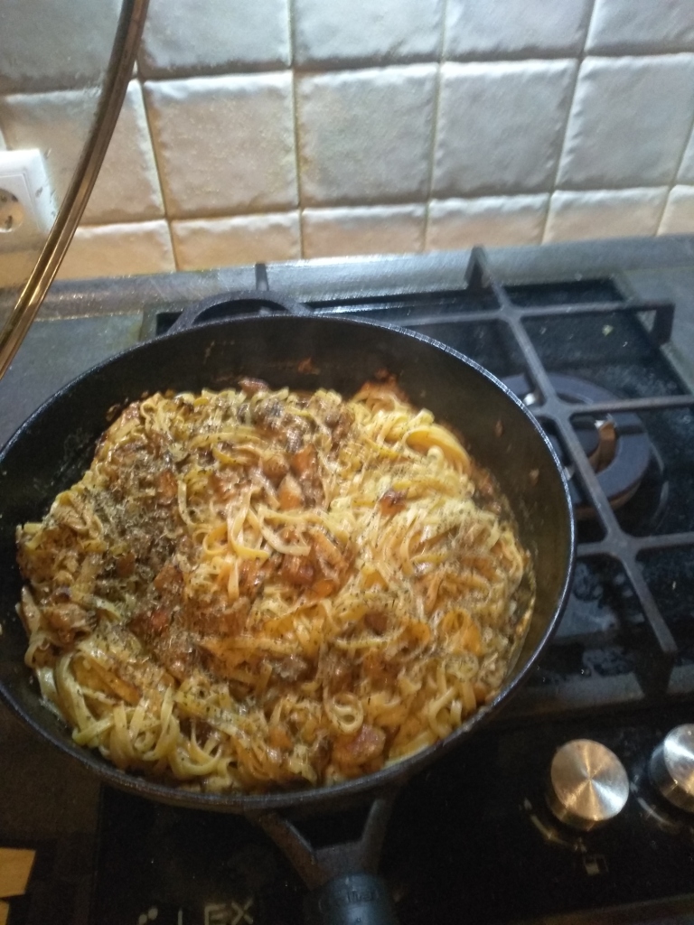 Пока вся эта херь происходит, варяцца макарошки аль денте, чтобы на момент готовности соуса сварились. Их на дуршлаг и в сковородку к соусу. Перемешал, посколько сливок было маловато долил полкружки воды из под макарошек, перемешал, посыпал базиликом и отстояцца под крышкой минут 5.