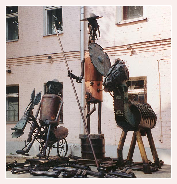 "Герой гениального романа Мигеля Сервантеса, Рыцарь Печального Образа Алонсо Кихада, бедный и очень благородный в душе испанский дворянин, помешался на чтении рыцарских романов и на подражании им. Он слепо верил в измышления поэтов, наивно представлял себе мир таким, каким они его изображали. Не зная жизни, он с самыми лучшими намерениями кидался в борьбу со злом и попадал из одного нелепого и грустного недоразумения в другое.